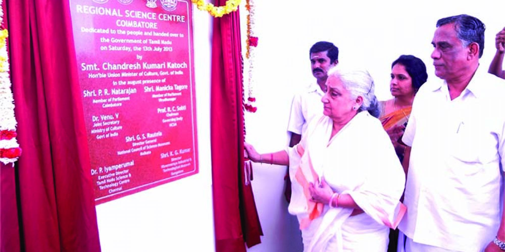 The Regional Science Centre at Coimbatore developed by National Council of Science Museums with the active support of Tamilnadu Science & Technology Centre (TNSTC), Govt. of Tamilnadu, was dedicated to the people and handed over to the Govt. of Tamil Nadu on July 13, 2013, by Smt. Chandresh Kumari Katoch, Hon’ble Union Minister of Culture, Govt. of India. The Science Centre, with a built up area of 4000 sq. mtr., houses three permanent galleries, namely ‘Hall of Textile’, ‘How Things Work’ and ‘Fun Science’ and a temporary exhibition hall. It also has 3D film show facility, Inflatable Dome Planetarium, air-conditioned Auditorium with audio-visual equipment, Science Demonstration corner, Children’s Activity corner, Library, Telescope for sky observation and other public facilities.
