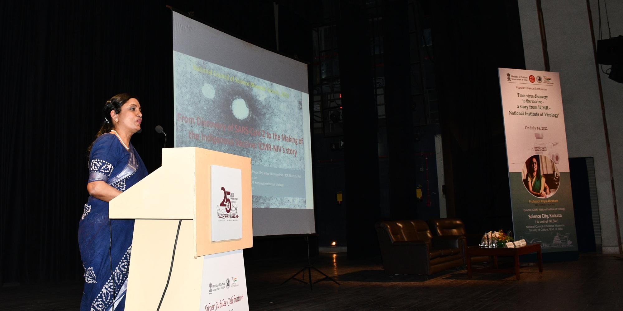 Today, a Popular Science Lecture titled “From Virus discovery to Vaccine – a story from ICMR-National Institute of Virology” was delivered by Prof. (Dr.) Priya Abraham, Director, ICMR-National Institute of Virology at Science City, Kolkata. During her lecture, Dr. Abraham highlighted the pivotal role ICMR-National Institute of Virology had played in India’s fight against the COVID-19 pandemic. She emphasized how the scientists of the institute worked tirelessly towards taming this pandemic and how ICMR-NIV contributed on several different fronts like- Discovery of the first cases of COVID-19 in India, the Viewing of the Virus under an Electron Microscope, Providing RT-PCR test across the country, conducting numerous online training sessions for laboratories across the country, Mission Iran, repatriation of other Indians stranded overseas, growing the virus in vitro for the first time in India, making the first antibody test for the nation, the start of the journey of the vaccine, monitoring the variants of the virus and the continuing journey.