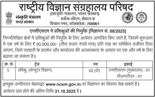 Interested candidates may see the details of advertisement on the website: www.ncsm.gov.in. The last date of receipt of applications is 31.10.2025.
