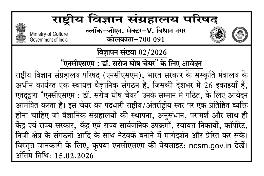 National Council of Science Museums (NCSM), an autonomous scientific organization functioning under the Ministry of Culture, Government of India and having its 26 units across the country, invites applications for “NCSM: Dr. Saroj Ghose Chair” constituted in his honour.